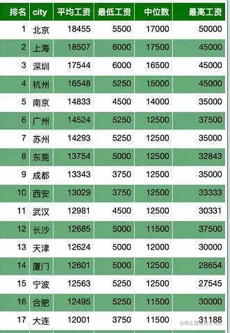 无论是哪个程序员,必须选择一个城市去奋斗,所以对城市薪资的期待值,往往是众多IT子弟更希望获取的。 首先,北京众望所归,依然是众多城市的天花板 ,平均薪资待遇也来到了18455,其中最高工资的码农也来到了五万。不得不说,在IT这个圈子,即使是敲代码,也能实现年入百万。