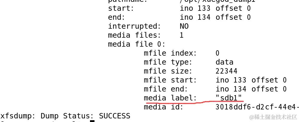 [root@xuegod63 ~]# xfsdump -f /opt/xuegod_dump1 -s xuegod /dev/sdb1 -L dump_xuegod -M sdb1