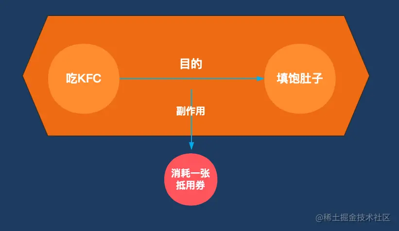可以看到吃KFC填饱肚子这一过程的副作用是消耗一张抵用券。诚然这是我们愿意看到的结果:既填饱了肚子又获得了优惠。这是一个对我们有利的副作用,换言之我们利用了副作用。