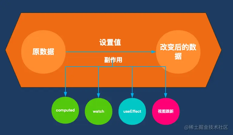 然而上面这个模型并不是最抽象的模型。因为可以看到 computed、watch、useEffect、视图变化 均为数据改变所产生的副作用。