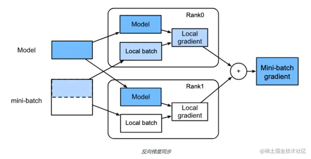上述是主流框架中数据并行的实现过程。和单卡训练相比,最主要的区别在于反向计算中的梯度需要在所有进程中进行同步,保证每个进程上最终得到的是所有进程上梯度的平均值。