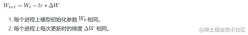 因为训练过程的每一个step 都会更新模型参数,每个进程处理不同的数据会得到不同的Loss。由Loss计算反向梯度并更新模型参数后,如何保证进程间模型参数正确同步,是数据并行需要解决的最主要问题。根据下面中的梯度更新公式,只要保证以下两点就能解决这个问题: