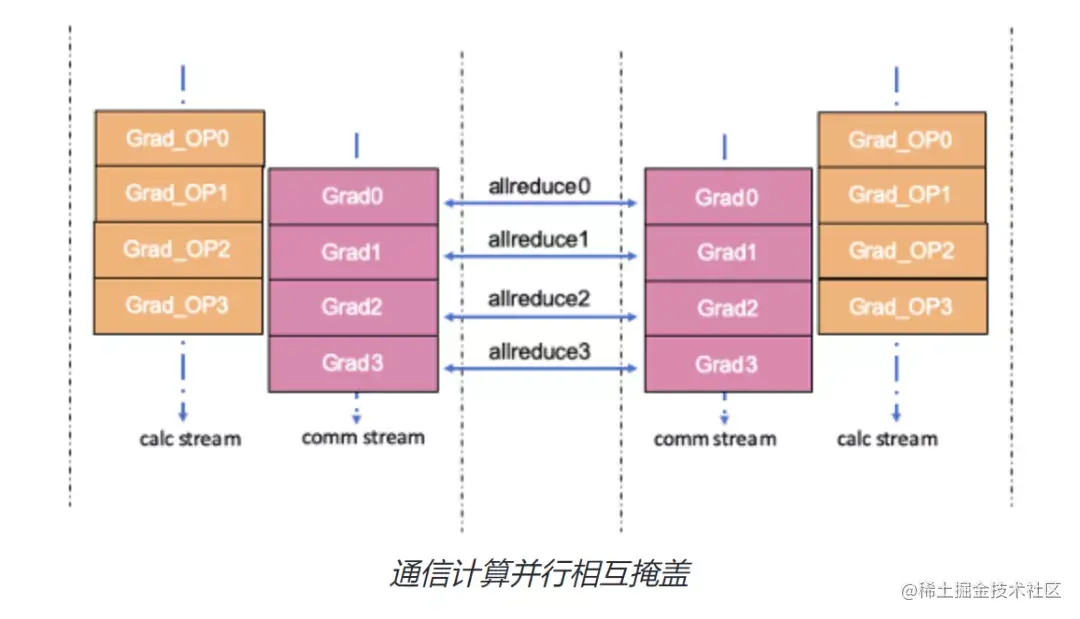 除了降低绝对的通信耗时,还可以从降低整体训练耗时角度来优化,可以考虑通信和计算的异步流水实现。数据并行中的梯度同步Allreduce通信是在训练的反向过程中进行的,而Allreduce 后得到的同步梯度是在训练的更新过程中才被使用,在反向中并没有被使用。也就是说上一个梯度的通信和下一个梯度的计算间并没有依赖,通信和计算可以并行,让两者的耗时相互重叠掩盖,减少反向的耗时。
