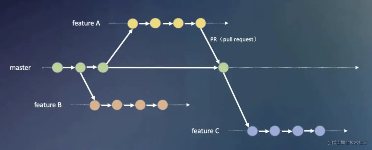 功能分支工作流,这种工作方式是以集中式工作流为基础,再为不同功能开发分配单独的功能分支来进行的;这种工作流的主干分支仍然是 master 分支,但是开发者在进行日常需求开发时不能将代码直接提交到 master 分支上,一般是为特定的需求新建一个功能分支,并且取一个具有描述性的名字,例如:feat-add-new-page、issue-#94320,描述性的名称可以让其他开发者快速地明白这个功能分支的主要作用,提高不同开发者之间的协同效率。