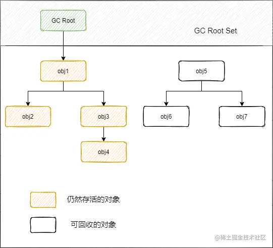 通过GC Root对象为起点,从这些节点向下搜索,搜索所走过的路径叫引用链,当一个对象到GC Root没有任何的引用链相连时,说明这个对象是不可用的。