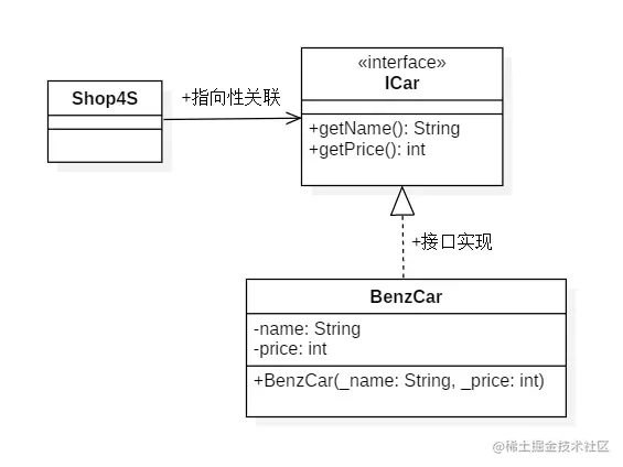 ICar接口定义了汽车的两个属性:名称和价格。BenzCar是一个奔驰车的实现类,代表奔驰车的总称。Shop4S代表售卖的4S店,ICar接口的代码清单如下