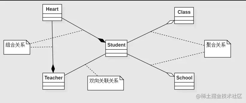 如上图所示,Heart 和Student、Teacher 都是一种“强”关联,人不能摆脱心脏而存在,即组合关系,而Student和Class、School是一种 “弱”关联,脱离了学校、班级,学生还能属于社会或其他团体,即聚合关系。