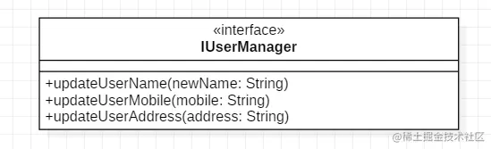 这里我们定义“更新用户” 的接口, 倘若有一天新来的前端要求加一个修改用户密码的接口,后端直接说:”你去调 updateUser”接口吧,传入密码信息就行。这种后端往往不是太懒就是新手,updateUser 接口的粒度太粗,接口职责不够单一,所以应该将接口拆分为各个细分接口,比如修改如下: