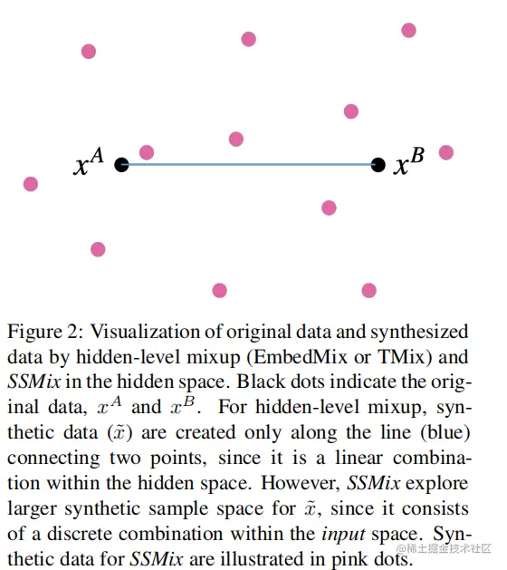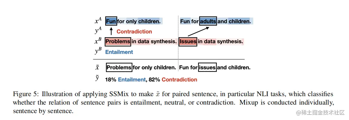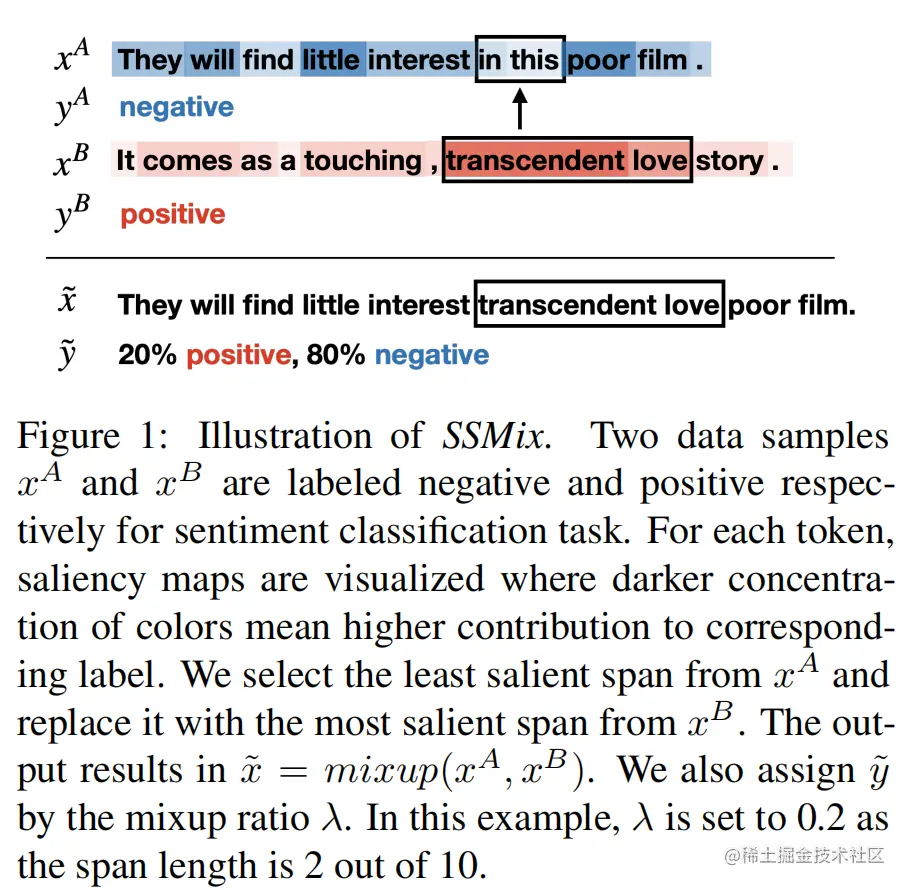 SSMix基本原理为:给定两个文本和,通过将文本的片段替换为来自另一文本的显著信息片段生成得到新的文本。同时,对于新文本,基于两个文本标签和重新为新文本设置一个新的标签。最后可以使用这个生成的增强虚拟样本(,)来进行训练模型。