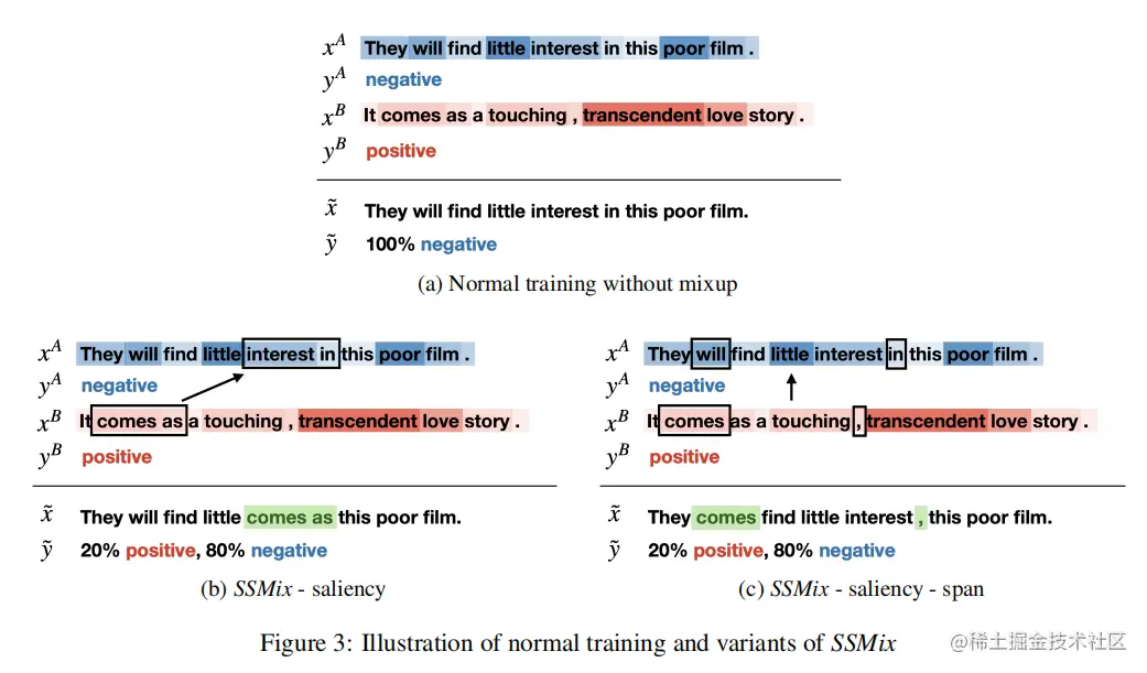 本文将原始()的长度和替换()跨度设置为相同的,主要原因是使用不同长度的span(片段)将导致冗余和语义不明确的mixup 转换。另外,计算不同长度的span之间的mixup 比列也过于复杂。在以往研究中也采用了这种相同大小的替换策略。在替换span长度相同的情况下,论文的SSMix算法能够使显著性的效果最大化。由于SSMix不限制字符的位置,可以同时选择最显著的span和被替换的最不显著片段。如图片1中,in this在文本中是不显著的,transcedent love在文本中是最显著的,那么可以用transcedent love替换in this。