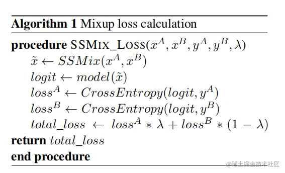 算法1展示了如何利用原始样本对来计算增广样本的混合损失。公式中计算了增强输出logit相对于每个样本的原始目标标签的交叉熵损失,并通过加权和进行组合,因此SSMix算法与数据集标签个数是不相关的,在任何数据集上,输出标签比例是通过两个原始标签的线性组合来计算。