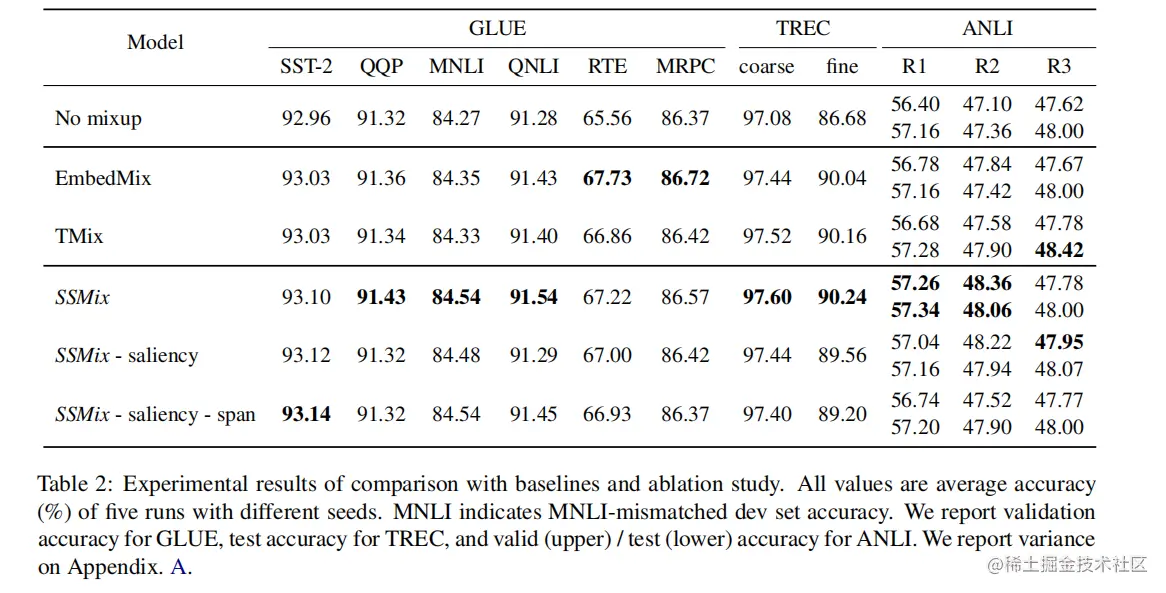 与基线和消融研究的实验结果进行了比较。所有的准确率值都是使用不同种子的5次运行的平均精度(%)。MNLI表示MNLI-不匹配的开发集的准确性。论文报告了GLUE的验证精度,TREC的测试精度,以及ANLI的有效(上)/测试(较低)精度,可以看出SSMix在大部分数据集效果要优于其他混合增强算法。