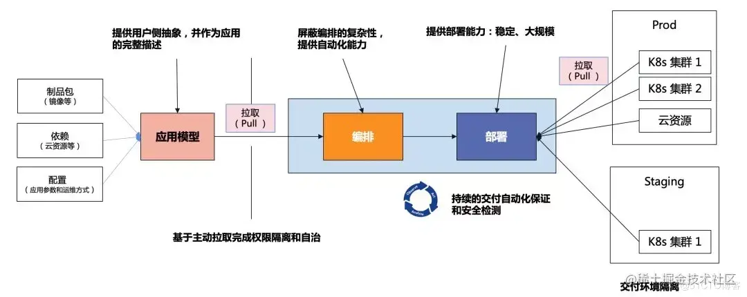 这个体系的入口是一个完整的应用模型,涵盖不同的交付物、云资源、以及各类环境编排的配置,它是应用交付的统一入口,也是唯一的依据。