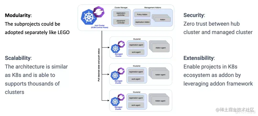 安全: OCM 在设计上以零信任和最小权限为基础,管理组件和被管理上的 agent 之间的注册通信采用两次握手的方式。此外证书的更新,访问权限的管理,权限 token 的分发也采用和 Kubernetes 类似的设计,由相应的可扩展组件通过 Kubernetes 原生 API 方式实现。