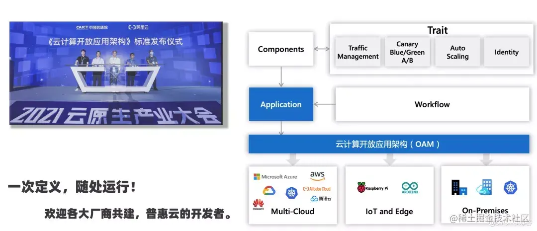 KubeVela 背后有一个完整的应用模型,那就是 OAM(Open Application Model)。OAM 是阿里和微软在 2019 年联合发布的应用模型,如今已经被阿里、微软、Oracle、Salesforce、腾讯等众多云厂商实践到云产品中,同时也被国家信通院立项作为《云计算开放应用架构》行业标准发布。