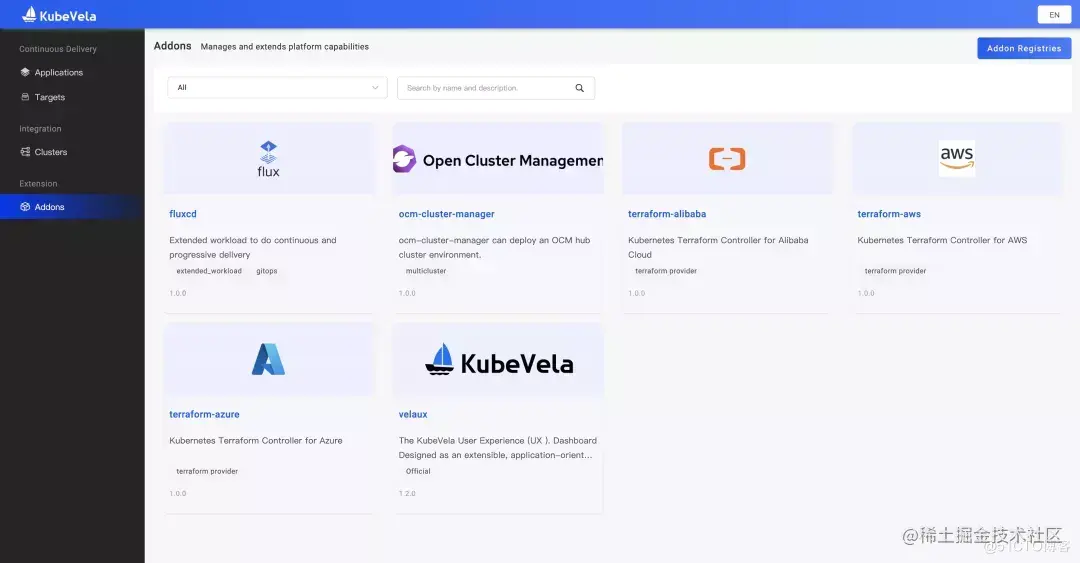 KubeVela 也不仅局限于 Kubernetes 生态,官方内置的云资源插件就可以集成任意的 terraform 模块,交付不同的云资源,甚至虚拟机。同时得益于 OAM 模型以及 KubeVela 从设计之初就严格遵循的可扩展性原则,用户可以轻易的增加和扩展生态的能力。