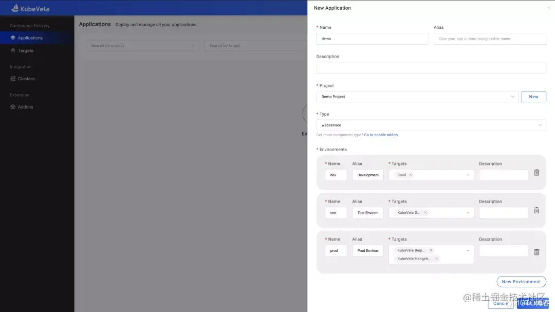 KubeVela 端到端的 UI 体系中,也默认添加了环境的概念,支持应用开发和交付生命周期中涉及到的不同环境,例如开发、测试、生产环境等。同一个应用在不同的环境中部署完全隔离,安全可靠,同时又无需用户重复配置,给用户带来了一致的体验。