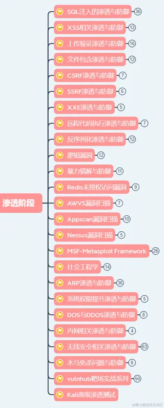 其中每个知识点下,又细分了不少内容,由于篇幅有限,写太多了也没人看,渗透篇我已经罗列整理为一套完整的思维导图了,如果你真的想深入了解,可以👉IT影子 的个人主页 - 动态 - 掘金,取得这份渗透学习路线。