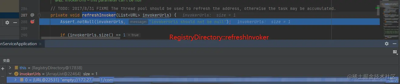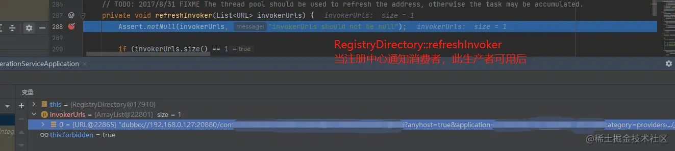 - 下面一张图就是当生产者停用的时候注册中心会马上通知消费者,在笔者这里本地测的时候是瞬间,但是这个笔者不确定,可能要去看看Nacos是怎么处理生产者下线的。当通知下线的时候也会清空invoker里面的client这个时候调用就自然rpc异常了。所以在滚动发布的时候,可以等待1分钟再去停用另外一个节点。