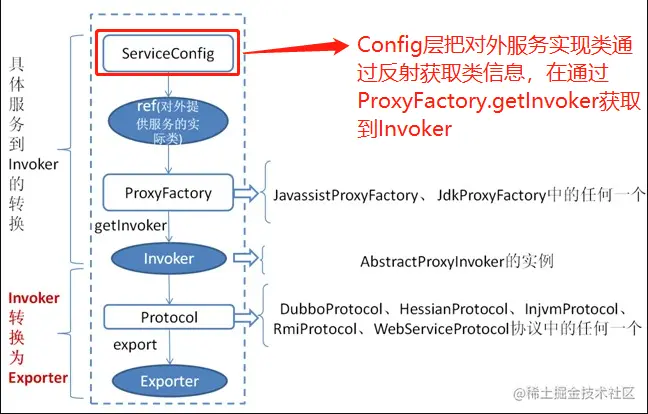 如上图: 首先ServiceConfig 类拿到对外提供服务的实际类 ref(如:HelloWorldImpl),然后通过 ProxyFactory 类的 getInvoker 方法使用 ref 生成一个 AbstractProxyInvoker 实例,到这一步就完成具体服务到 Invoker 的转化。接下来就是 Invoker 转换到 Exporter 的过程。Dubbo 处理服务暴露的关键就在 Invoker 转换到 Exporter 的过程,上图中的红色部分。下面我们以 Dubbo 和 RMI 这两种典型协议的实现来进行说明:Dubbo 的实现 Dubbo 协议的 Invoker 转为 Exporter 发生在 DubboProtocol 类的 export 方法,它主要是打开 socket 侦听服务,并接收客户端发来的各种请求,通讯细节由 Dubbo 自己实现。