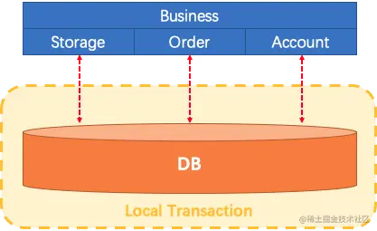 首先,来看下传统的单体应用(Monolithic App)。下图是一个单体应用的 3 个 模块,在同一个数据源上更新数据来完成一项业务,整个过程的数据一致性可以由数据库的本地事务来保证,如下图: