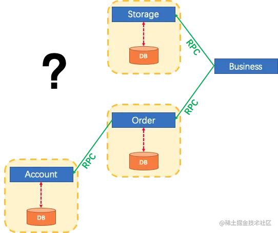随着业务需求和架构的变化,单体应用进行了服务化拆分:原来的 3 个 模块被拆分为 3 个独立的服务,每个服务使用独立的数据源(Pattern: Database per service)。整个业务过程将由 3 个服务的调用来完成,如下图: