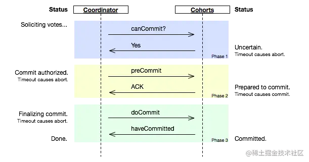 正因为这个原因,三阶段协议(Three-phase commit protocol, 3PC)对二阶段协议进行了改进: