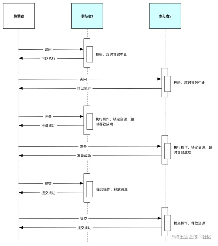 - 如果每个参与者在准备阶段都返回ACK确认(即事务执行成功),则协调者向参与者发起提交指令(doCommit),参与者收到指令后提交事务,并释放锁定的资源,最后响应ACK;