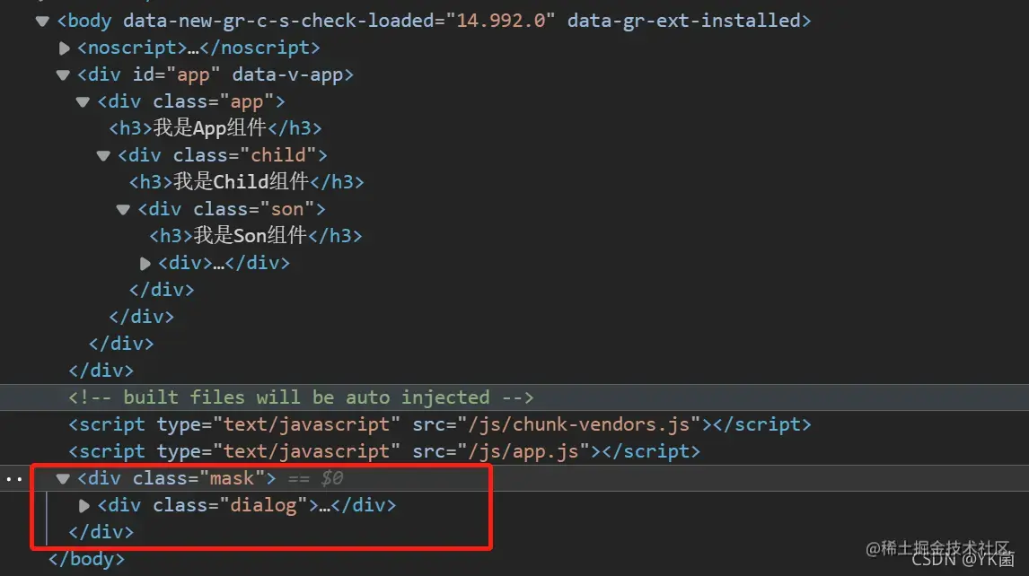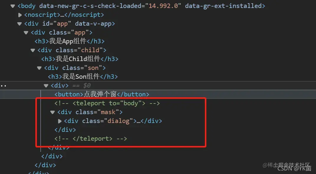 我故意给最里面的盒子加了定位,因为相对定位会找他外层最近的定位盒子进行定位,所以效果就是这样了,我们希望这个弹窗是在body下呈现的. 我们在Dialog组件中加一个teleport标签