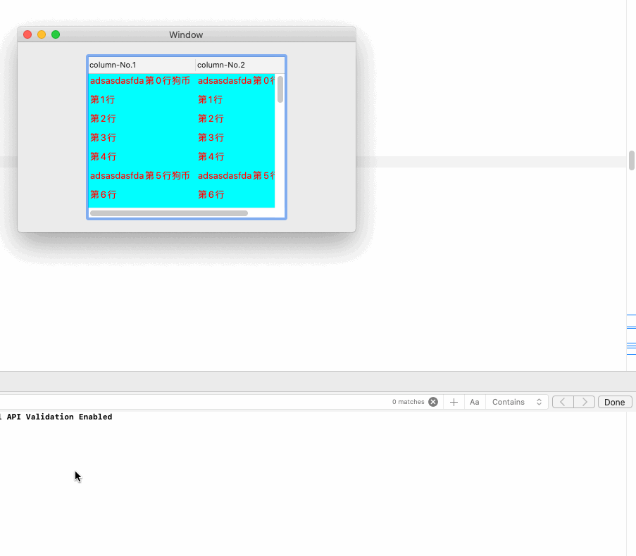 let scrollV = NSScrollView(frame: leftV.bounds)//NSScrollView()//是否设置尺寸无所谓——下方会添加约束 leftV .addSubview(scrollV) scrollV.hasVerticalRuler = true scrollV.hasHorizontalScroller = true scrollV.hasVerticalScroller = true //需要添加约束——否则不会添加上ScrollView滑动视图 scrollV.translatesAutoresizingMaskIntoConstraints = false//添加约束 let scrollV_Lead = scrollV.leadingAnchor .constraint(equalTo: leftV.leadingAnchor, constant: 0.0) let scrollV_Trail = scrollV.trailingAnchor .constraint(equalTo: leftV.trailingAnchor, constant: 0.0) let scrollV_Top = scrollV.topAnchor .constraint(equalTo: leftV.topAnchor, constant: 0.0) let scrollV_Bot = scrollV.bottomAnchor .constraint(equalTo: leftV.bottomAnchor, constant: 0.0) let scrollV_consArr = [scrollV_Lead, scrollV_Trail, scrollV_Top, scrollV_Bot] leftV .addConstraints(scrollV_consArr) scrollV.wantsLayer = true scrollV.layer?.backgroundColor = NSColor.red.cgColor let tableV = NSTableView(frame: leftV.bounds)//NSTableView()//是否设置尺寸无所谓——下方放置到ScrollView的documentView中 leftV .addSubview(tableV) scrollV.contentView.documentView = tableV//scrollV.documentView //不能添加约束——否则尺寸不能调整(宽不能调整)❌❌❌ //tableV.translatesAutoresizingMaskIntoConstraints = false//添加约束 //let tableV_Lead = tableV.leadingAnchor .constraint(equalTo: leftV.leadingAnchor, constant: 0.0) //let tableV_Trail = tableV.trailingAnchor .constraint(equalTo: leftV.trailingAnchor, constant: 0.0) //let tableV_Top = tableV.topAnchor .constraint(equalTo: leftV.topAnchor, constant: 0.0) //let tableV_Bot = tableV.bottomAnchor .constraint(equalTo: leftV.bottomAnchor, constant: 0.0) //let tableV_consArr = [tableV_Lead, tableV_Trail, tableV_Top, tableV_Bot] //leftV .addConstraints(tableV_consArr) tableV.wantsLayer = true tableV.layer?.backgroundColor = NSColor.cyan.cgColor tableV.delegate = self tableV.dataSource = self tableV.target = self; tableV.action = #selector(clickTableView) //添加列(必须) let column = NSTableColumn(identifier: NSUserInterfaceItemIdentifier(rawValue: "Colum-1")) column.width = 150//当前宽度 column.minWidth = 100//最小宽度 column.maxWidth = 200//最大宽度 column.title = "column-No.1" column.headerToolTip = column.title column.resizingMask = NSTableColumn.ResizingOptions.userResizingMask tableV .addTableColumn(column) let column2 = NSTableColumn(identifier: NSUserInterfaceItemIdentifier(rawValue: "Colum-2")) column2.width = 150//当前宽度 column2.minWidth = 100//最小宽度 column2.maxWidth = 200//最大宽度 column2.title = "column-No.2" column2.headerToolTip = column2.title column2.resizingMask = NSTableColumn.ResizingOptions.userResizingMask tableV .addTableColumn(column2)}
