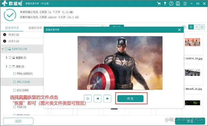 步骤3.扫描完成,隐形的文件都呈现在这里,选择你想要恢复的文件,然后双击预览(图片大部分是可详细预览的),点击“恢复”,选定恢复的位置就OK了!