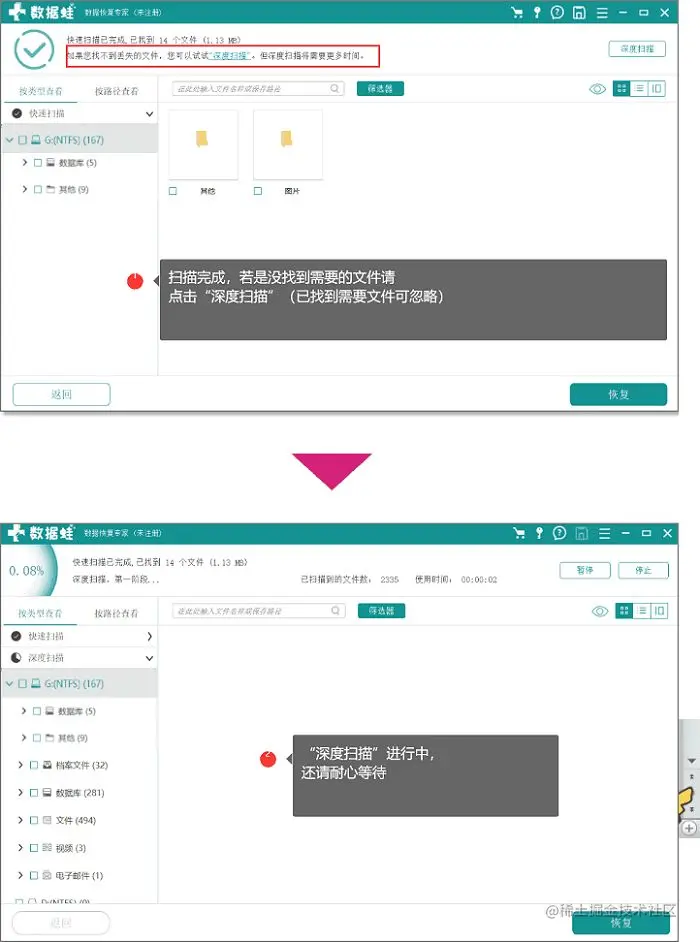 备注:可能由于时间差的关系,扫描会不全面,快速扫描的速度虽然比较快,但是扫描力度和手(范围)就没伸的那么长,仅扫描删除时间段排在最近的文件。所以我们点击“深度扫描”(已找到想要的文件请忽略),虽然用时稍长,但是质量可是妥妥的上去了!请耐心等待;