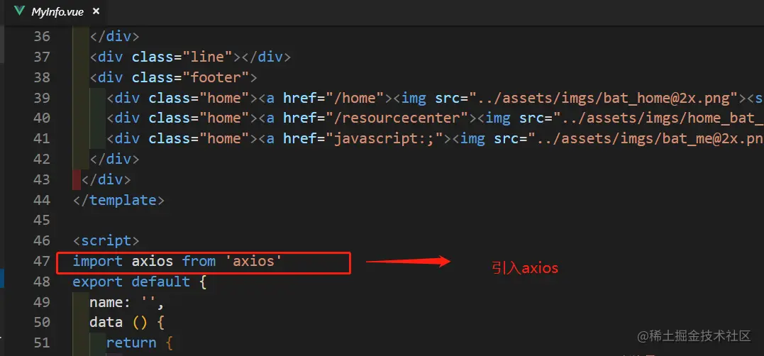 比如我们在项目中的myInfo.vue中使用axios,当组件在创建成功后发送Ajax请求得到用户信息展示在我们面前。先引入,然后在组件生命周期函数created中发请求。