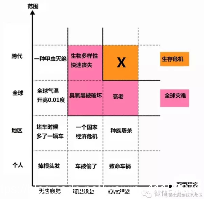 可以看到,生存危机是用来指那些跨物种、跨代(永久伤害)并且有严重后果的事情。它可以包括人类遭受永久苦难的情况,但是这基本上和灭绝没差了。三类事情可能造成人类的生存危机: