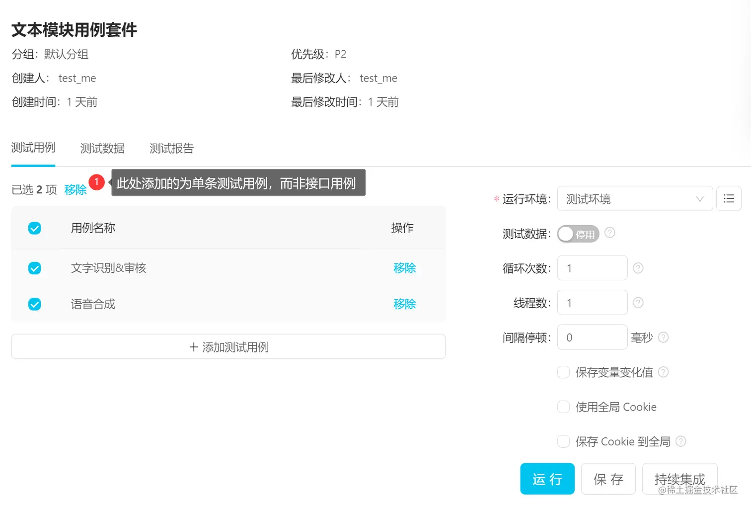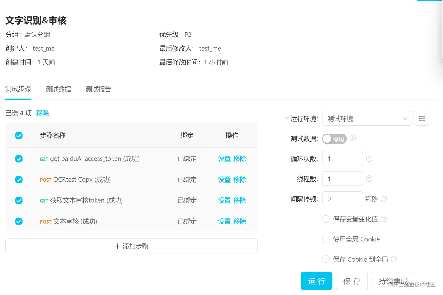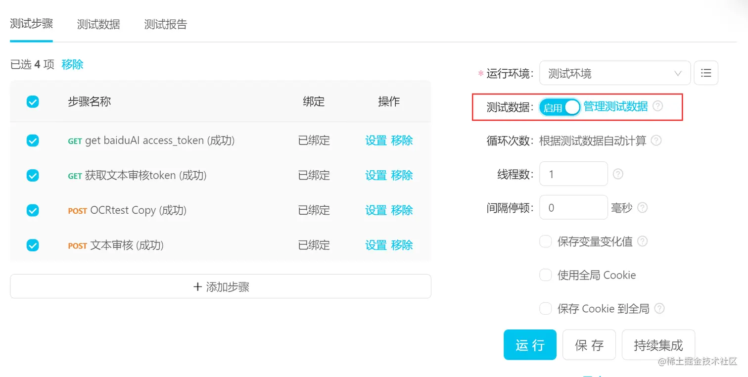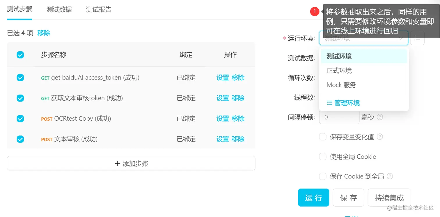 在用例的右侧,有运行环境和保存变量变化值等配置,可以根据项目的实际需要选用。 其中[间隔停顿]和[使用全局cookie]在接口测试中应用频率较高。