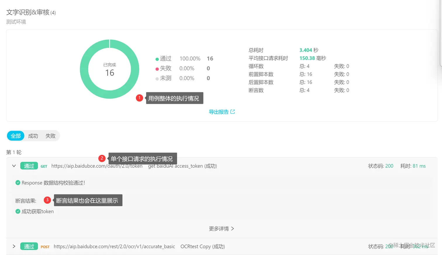 点击[运行]按钮,运行成功会跳转到运行结果页面。还可以导出测试报告。