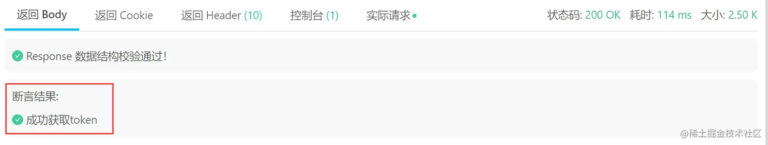 请求发出之后,如果返回值符合预期,则在返回处会提示断言成功,失败则给予错误提示。