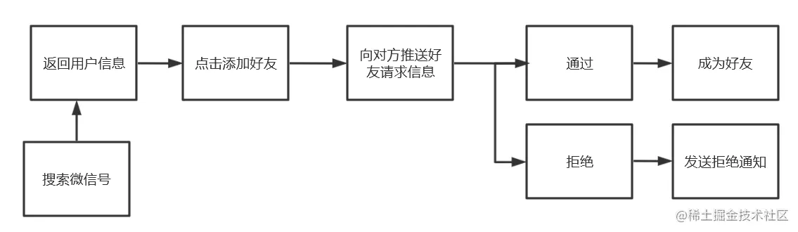 一个业务场景通常需要多个接口才能走完一个完整的业务流程,其中每个接口完成一个特定的功能步骤。例如微信的添加好友流程: