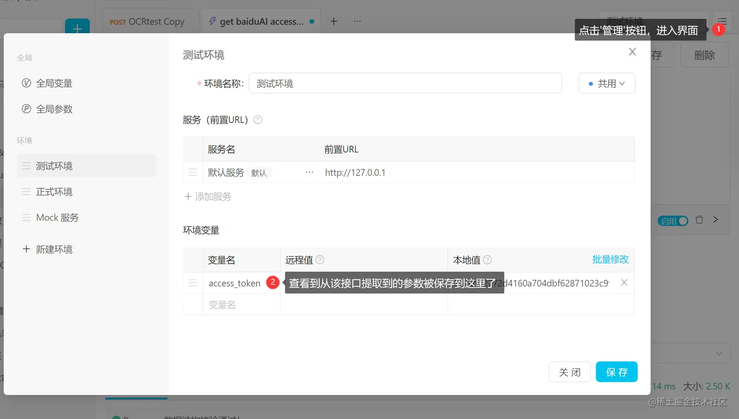 2)该字段会保存到项目设置中,同一环境,同一项目里的其他接口具有调用权限。 运行一下上图中的接口,可以看到该字段已经被提取到变量设置中了。