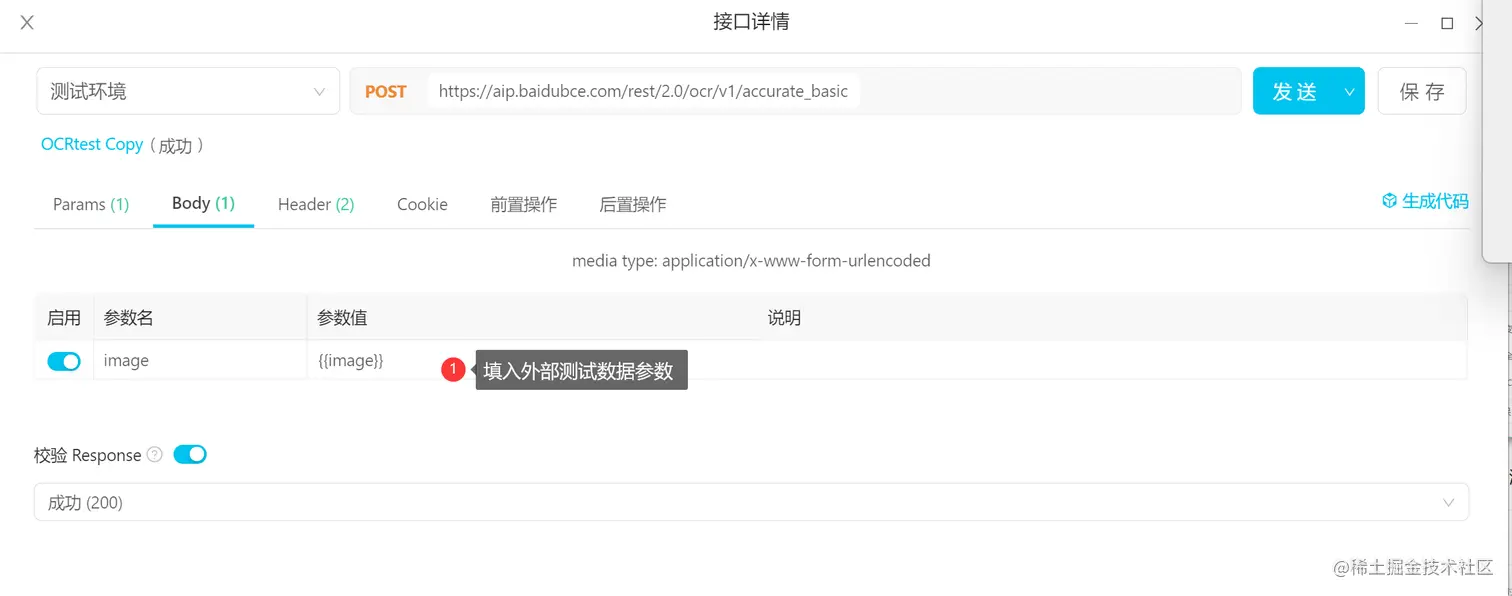 看一下结果: 发送该post请求,在接口>运行>实际请求tab>请求URL中可以看到,该参数已被成功调用