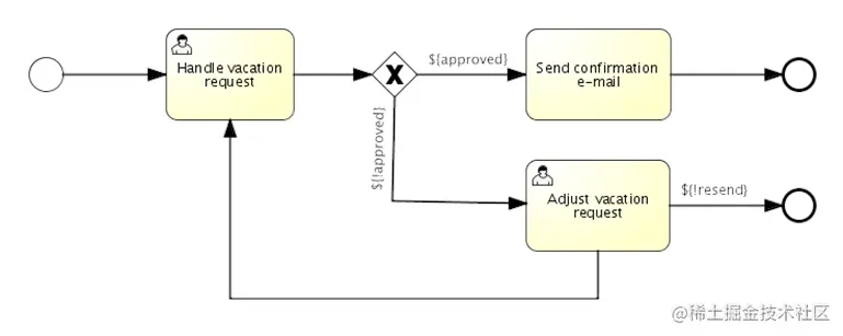 <startEvent id="request" activiti:initiator="employeeName"> <extensionElements> <activiti:formProperty id="numberOfDays" name="Number of days" type="long" value="1" required="true"/> <activiti:formProperty id="startDate" name="First day of holiday (dd-MM-yyy)" datePattern="dd-MM-yyyy hh:mm" type="date" required="true" /> <activiti:formProperty id="vacationMotivation" name="Motivation" type="string" /> </extensionElements> </startEvent> <sequenceFlow id="flow1" sourceRef="request" targetRef="handleRequest" /> <userTask id="handleRequest" name="Handle vacation request" > <documentation> ${employeeName} would like to take ${numberOfDays} day(s) of vacation (Motivation: ${vacationMotivation}). </documentation> <extensionElements> <activiti:formProperty id="vacationApproved" name="Do you approve this vacation" type="enum" required="true"> <activiti:value id="true" name="Approve" /> <activiti:value id="false" name="Reject" /> </activiti:formProperty> <activiti:formProperty id="managerMotivation" name="Motivation" type="string" /> </extensionElements> <potentialOwner> <resourceAssignmentExpression> <formalExpression>management</formalExpression> </resourceAssignmentExpression> </potentialOwner> </userTask> <sequenceFlow id="flow2" sourceRef="handleRequest" targetRef="requestApprovedDecision" /> <exclusiveGateway id="requestApprovedDecision" name="Request approved?" /> <sequenceFlow id="flow3" sourceRef="requestApprovedDecision" targetRef="sendApprovalMail"> <conditionExpression xsi:type="tFormalExpression">${vacationApproved == 'true'}</conditionExpression> </sequenceFlow> <task id="sendApprovalMail" name="Send confirmation e-mail" /> <sequenceFlow id="flow4" sourceRef="sendApprovalMail" targetRef="theEnd1" /> <endEvent id="theEnd1" /> <sequenceFlow id="flow5" sourceRef="requestApprovedDecision" targetRef="adjustVacationRequestTask"> <conditionExpression xsi:type="tFormalExpression">${vacationApproved == 'false'}</conditionExpression> </sequenceFlow> <userTask id="adjustVacationRequestTask" name="Adjust vacation request"> <documentation> Your manager has disapproved your vacation request for ${numberOfDays} days. Reason: ${managerMotivation} </documentation> <extensionElements> <activiti:formProperty id="numberOfDays" name="Number of days" value="${numberOfDays}" type="long" required="true"/> <activiti:formProperty id="startDate" name="First day of holiday (dd-MM-yyy)" value="${startDate}" datePattern="dd-MM-yyyy hh:mm" type="date" required="true" /> <activiti:formProperty id="vacationMotivation" name="Motivation" value="${vacationMotivation}" type="string" /> <activiti:formProperty id="resendRequest" name="Resend vacation request to manager?" type="enum" required="true"> <activiti:value id="true" name="Yes" /> <activiti:value id="false" name="No" /> </activiti:formProperty> </extensionElements> <humanPerformer> <resourceAssignmentExpression> <formalExpression>${employeeName}</formalExpression> </resourceAssignmentExpression> </humanPerformer> </userTask> <sequenceFlow id="flow6" sourceRef="adjustVacationRequestTask" targetRef="resendRequestDecision" /> <exclusiveGateway id="resendRequestDecision" name="Resend request?" /> <sequenceFlow id="flow7" sourceRef="resendRequestDecision" targetRef="handleRequest"> <conditionExpression xsi:type="tFormalExpression">${resendRequest == 'true'}</conditionExpression> </sequenceFlow> <sequenceFlow id="flow8" sourceRef="resendRequestDecision" targetRef="theEnd2"> <conditionExpression xsi:type="tFormalExpression">${resendRequest == 'false'}</conditionExpression> </sequenceFlow> <endEvent id="theEnd2" /> -