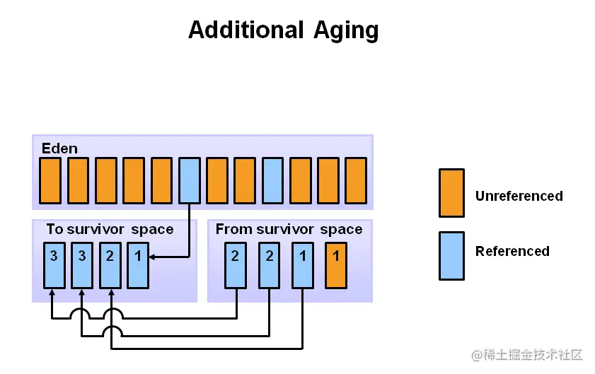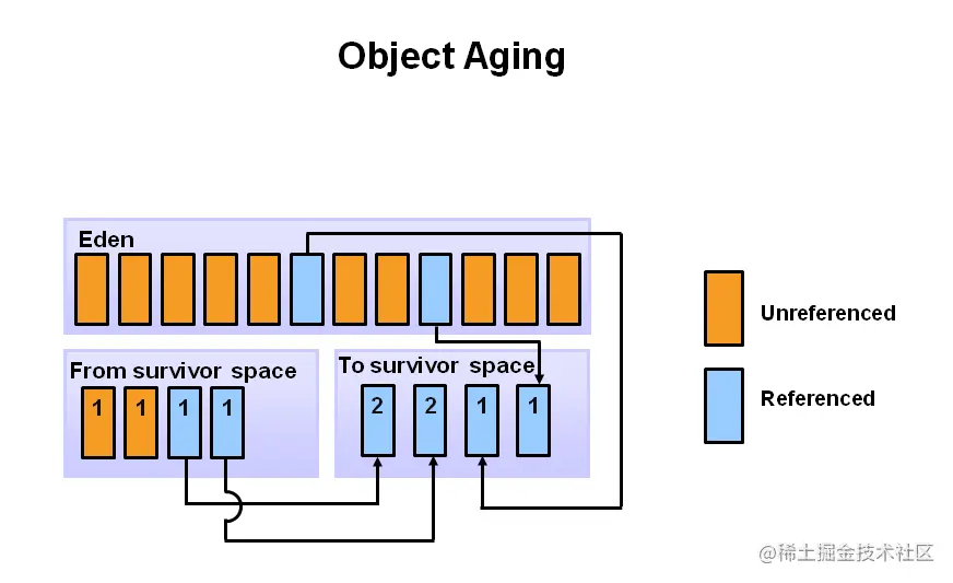 下一次Young GC 中仍被引用的对象(存活对象)会被复制到之前是空的Survivor空间(To survivor space ,实际是之前的S1 survivor space),Eden 空间未被引用的对象将被直接删除。 之前的S0 suvivor space现在称为Form survivor space,其中依赖被引用的对象,被复现到了之前是空的Survivor空间(To survivor space ),Form survivor space 未被引用的对象将被直接删除。仍被引用的对象从Form survivor space复制到To survivor space后,其对象年龄将加1,表明该对象又经历了一次Young GC。