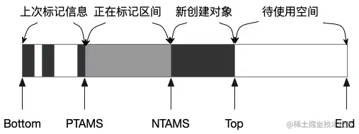 上图展示了某次并发标记过程中一个Region中 Bottom、PTAMS、NTAMS、Top、End指针位置,指针之间区域的含义。区间中的白色、灰色、黑色可以大致理解为三色标记法中的三种颜色。
