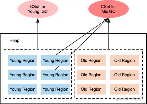 回收集(Collection Set,CSet),其代表每次GC暂停时回收的一系列目标分区。在任意一次收集暂停中,CSet所有分区都会被释放,内部存活的对象都会被转移到分配的空闲分区中。因此无论是年轻代收集,还是混合收集,工作的机制都是一致的。年轻代收集CSet只容纳年轻代分区,而混合收集会通过启发式算法,在老年代候选回收分区中,筛选出回收收益最高的分区添加到CSet中。