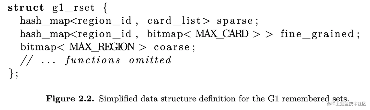 实际上HotSpot VM 中 G1的RSet具体实现要比上面说的更加复杂(上面说的只是其中的一种情况,Sparse粒度的情况 )。应用程序中可能存在频繁的更新引用情况,这会使得某些区域的RSet变成popular Region。G1 采用不同粒度的方式来处理RSet Popularity,RSet可分为Sparse、Fine、Coarse三种粒度。不同粒度时RSet内部采用不同的数据结构记录其他Region point-in 进来的引用 ,上面介绍的便是Sparse粒度时的情况。下面是 Evaluating and improving remembered sets in the HotSpot G1 garbage collector论文中给出的G1中 RSet 数据结构的简化定义。