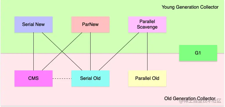 下面是一张关于HotSpot VM 中垃圾回收器如何组合分别处理年轻代与年老代的经典图。上面部分的Serial New、ParNew、Parallel Scavenge 都是专门用于处理新生代垃圾收集器,下面部分的CMS、Serial Old、Parallel Old是专门用于处理年老代的垃圾收集器,而处于中间的G1即能处理新生代也能处理年老代。图中的黑色实线代表哪些新生代垃圾收集器能与哪些年老代垃圾收集器组合工作。CMS与Serial Old之间的黑色虚线代表CMS发生concurrent mode failure时fail safe成Full GC采用Serial Old回收年老代垃圾。