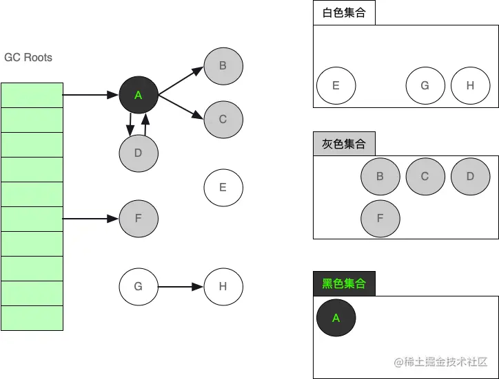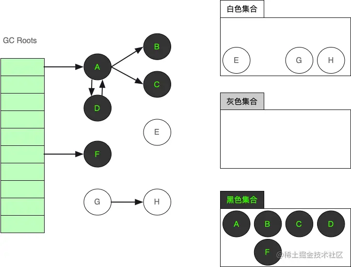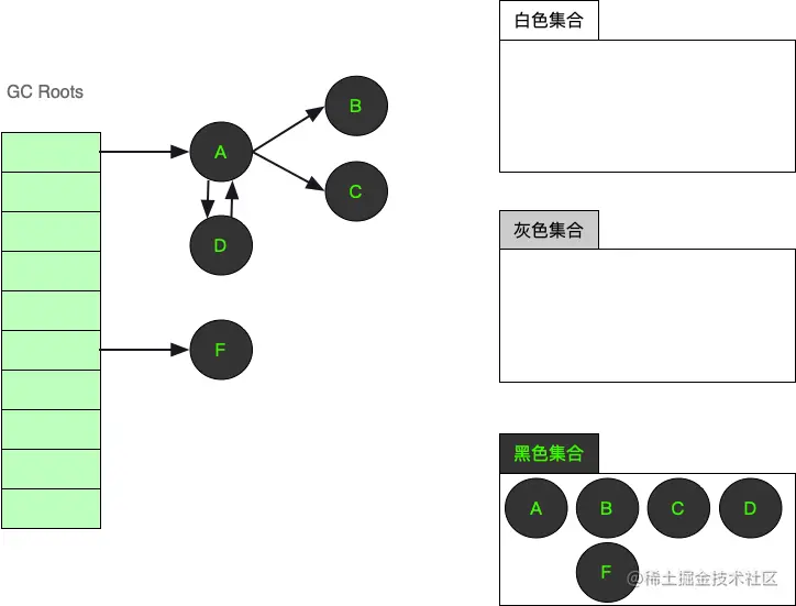 处理灰色集合中剩余的B对象、C对象、D对象与F对象后,B对象、C对象、D对象与F对象象已从灰色集移到黑色集合。