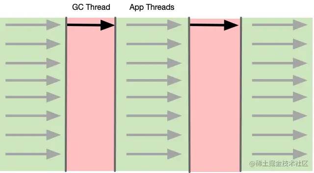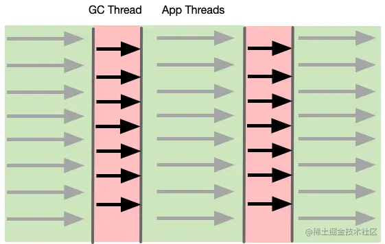 上图灰色箭头为应用线程,而黑色箭头为GC线程,并行垃圾回收器在STW时进行垃圾回收的线程相对于串行垃圾回收器而言变成了多个线程,并且这些线程同时进行垃圾回收工作。