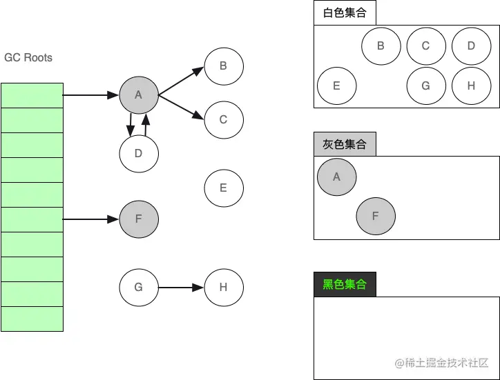 将GC Roots直接引用的对象从白色集合内移到灰色集合后,此时A对象与F对象已从白色集移到灰色集合。