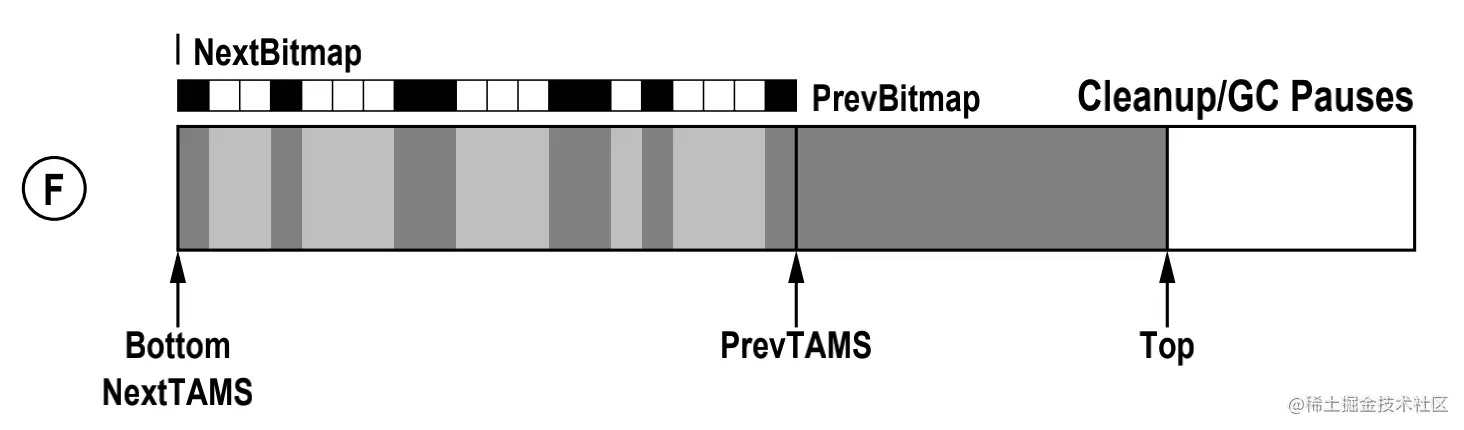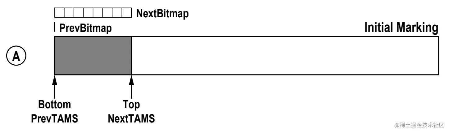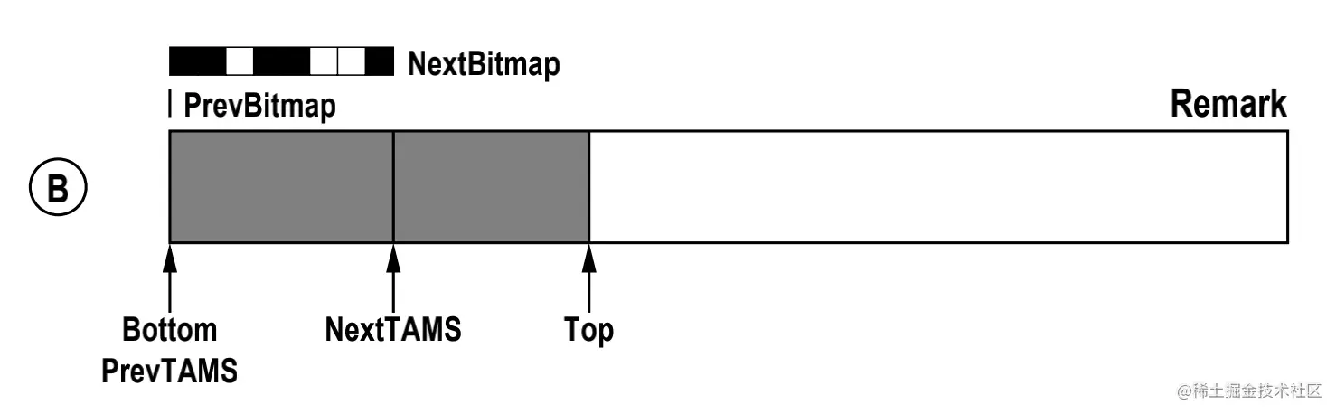 新一轮标记Initial Marking阶段,NextTAMS指针重新指向Top指针,PrevBitmap保证了上一次的标记信息,NextBitmap中有**[PrevTAMS, NextTAMS)区间**的块照。